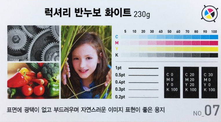 다른 명함 용지에 비해 인쇄후의 칼라 발색이 매우 우수합니다. 후가공 후에도 인쇄 품질이 우수하며 .